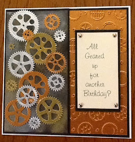 Using my Cogs/Gears die from Dies for all Occasions...the embossing is from Couture Creations and the sentiment is computer generated...I rubbed a piece of black card with some old Rub.n.Glo Finger metallics that I had and popped the die cuts on top.